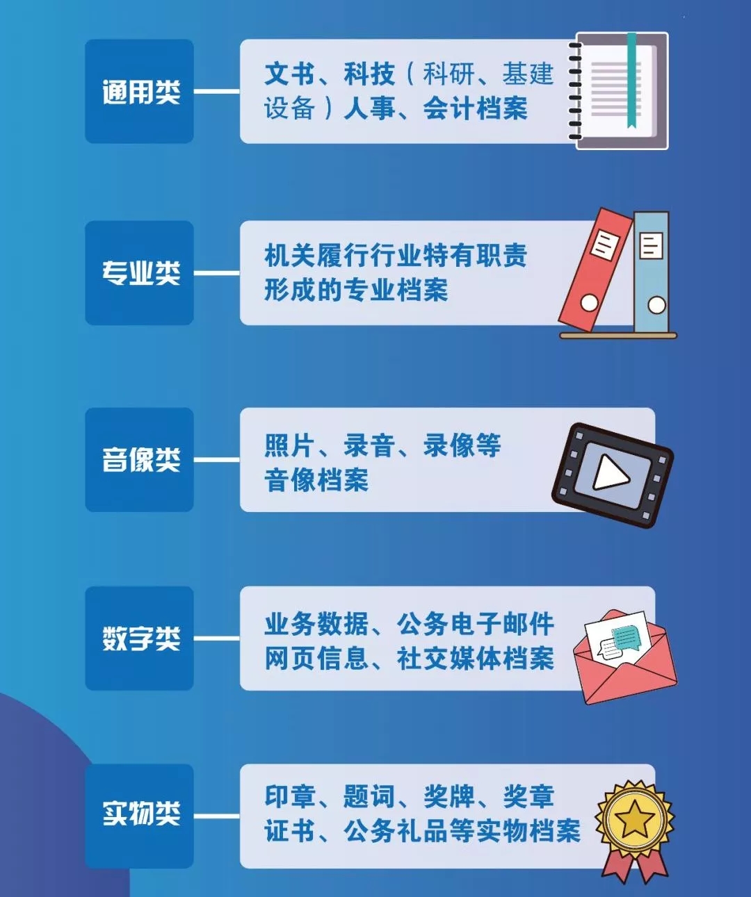 根据载体形态可划分为——纸质档案、非纸质档案,非纸质档案包括音像档案(照片档案、音视频档案)、实物档案(奖状、证书、奖杯、奖牌、锦旗、纪念品等)和电子档案等。